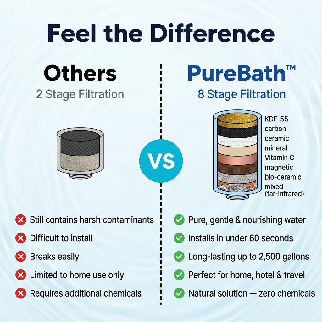 PureBath™'s 8-stage filtration eliminates up to 99% of the harsh contaminants hiding in your tap water — the ones your baby soaks in every single night.